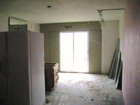 The wall between those two spaces has been removed, and the bathroom has been completely gutted out to create the fourth bedroom/ den.  This is what those spaces look like now (well, they looked like this last week -- they're a bit further along than this today).