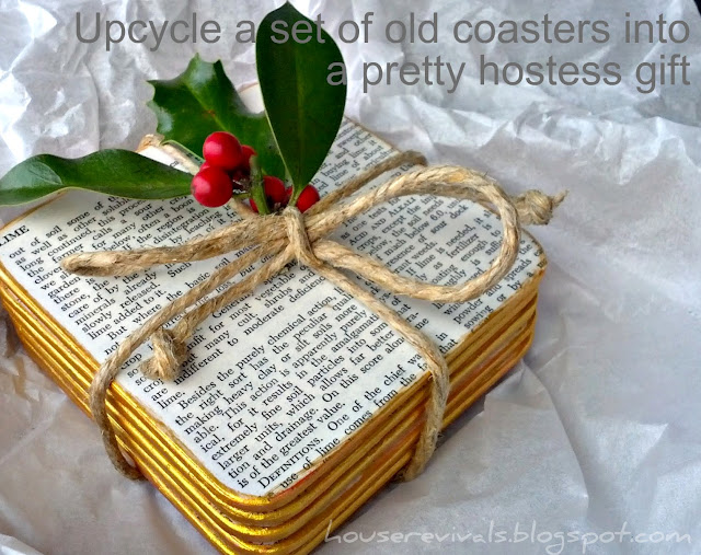 Do you always see sets of old coasters at the thrift store? My local Goodwill has them all the time -- dated, and a bit worse for wear. I decided to to grab some the other day to up-cycle into pretty hostess gifts.